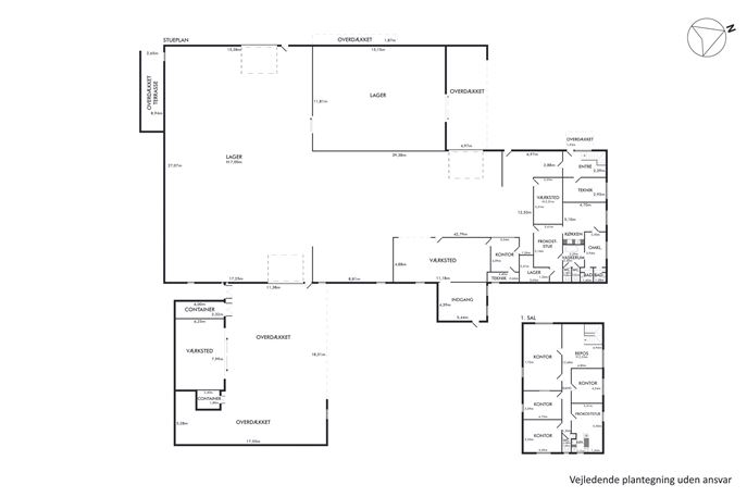 Ejendommen er på ialt 1.695 m² på en 4.231 m² grund. Der er gode udenomsarealer hvor der er plads til containere og parkering m.m.
