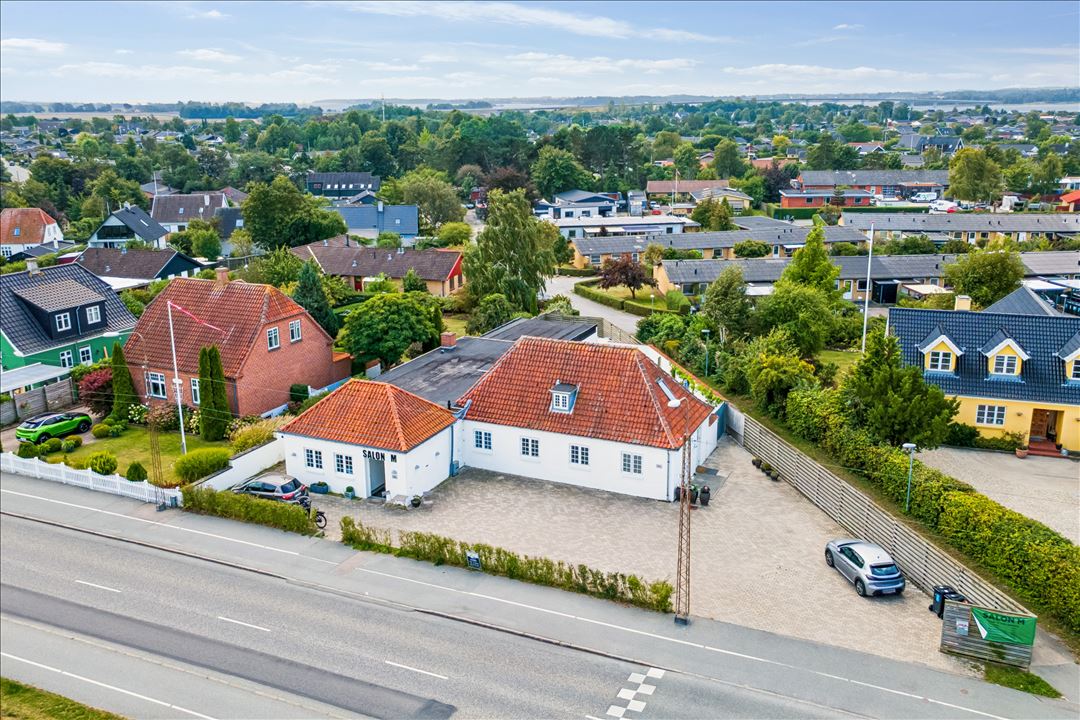 Erhvervsdelen er i dag indrettet i to afdelinger. Mod vejen er der en frisørsalon med kundetoilet og et lille tekøkken, mens den sydvestlige del har indgang via en lille have og solrig terrasse. Her findes et stort åbent rum med køkken, et mindre kontor eller værelse, et badeværelse med bruseniche samt et større disponibelt rum, der tidligere har været anvendt til opbevaring. Det nuværende lejemål med frisøren ophører ved salg, og ejendommen overtages derfor tom, hvilket giver den nye ejer fri disposition over hele ejendommen.