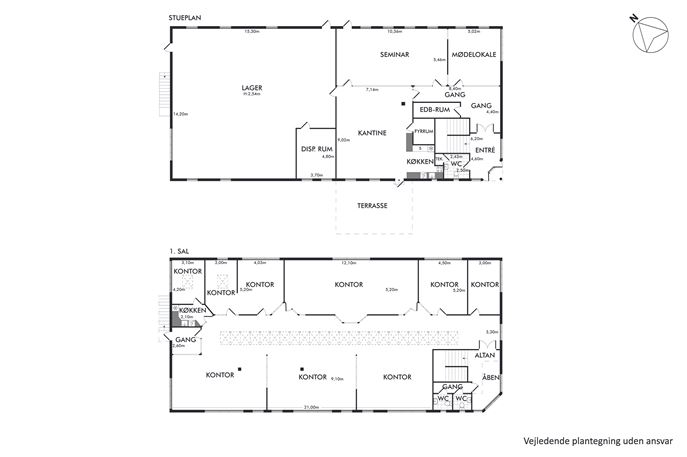 Lejemålet er indrettet med glasindgangsparti med adgang fra flisebelagt parkeringsplads til trapperum med trappe til 1. sal og med toiletter på begge etager, fra trapperum er der adgang til fordelingsgang med adgang til møderum samt stor rummelig kantine med anretterkøkken og adgang til udvendig fliseterrasse. Fra kantinen er der adgang til lagerlokaler, testrum og pakkeri med rulleport.