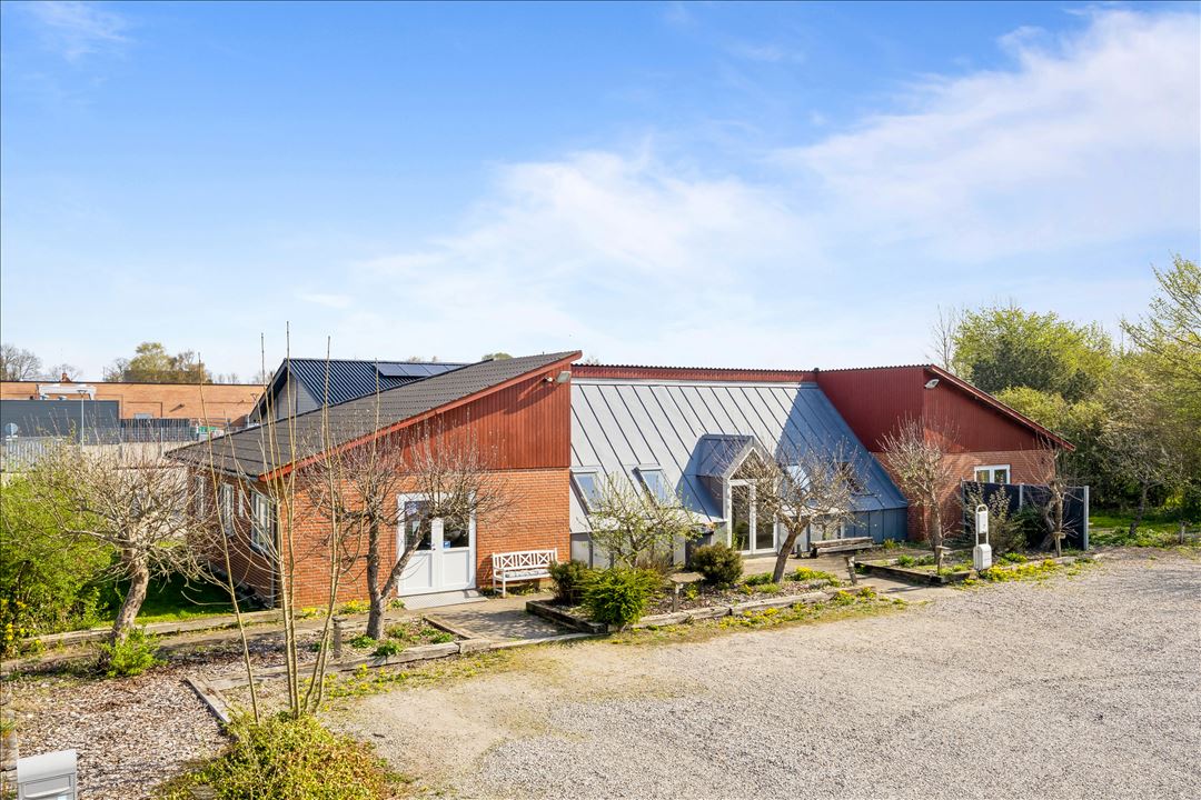 Grunden er ligeledes rummelig og funktionel med en stor grusbelagt parkeringsplads, som gør det let og bekvemt for både medarbejdere og besøgende at komme til og fra ejendommen.