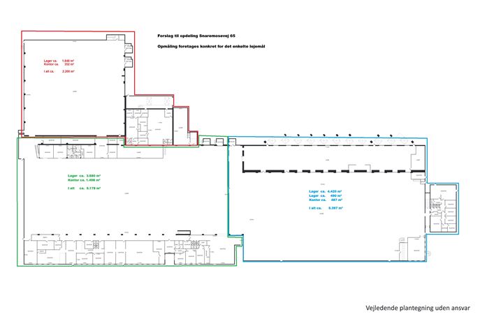 Ejendommen på Snaremosevej 63-65, 7000 Fredericia er en velholdt og rummelig ejendom med et samlet grundareal på 46.902 m², der er velegnet til virksomheder med behov for store lager- og produktionsfaciliteter kombineret med optimale logistikmuligheder.Ejendommen består af tre solide bygninger, opført i 1988 og senere, med et samlet bebygget areal på 14.989 m² og et samlet etageareal på 17.357 m². Af dette udgør 14.989 m² lager- og produktionsarealer, mens 2.158 m² er velegnet til kontorbrug. Derudover er der et kælderareal på 1.056 m², der kan bruges til velfærdsfaciliteter, arkiv eller ekstra opbevaring m.v.