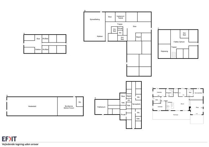 • I de 3 selvstændige lejligheder er der er plads til i alt ca. 19 sengepladser med køkkener, badefaciliteter og vaskemuligheder.
