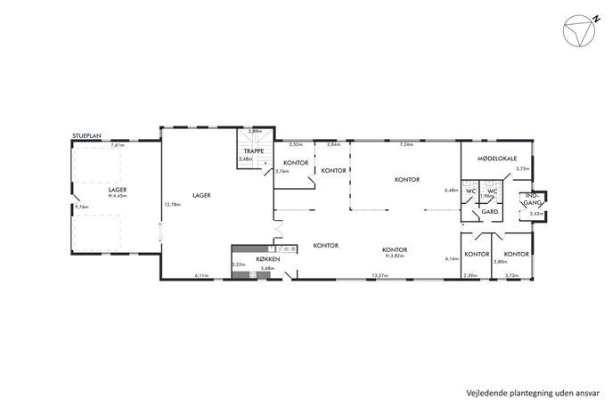 Lagerdelen er på ca. 194 m² og fremstår som et funktionelt og regulært areal med gode adgangsforhold. Der er to porte på hver ca. 3 x 3,8 meter (B x H), hvilket muliggør effektiv ind- og udlastning. Loftshøjden er omkring 4 meter. Derudover råder ejendommen over en kælder på ca. 60 m², der kan anvendes til arkiv, teknikrum eller yderligere opbevaring.