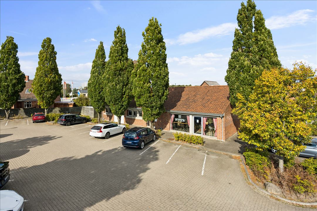 Der hører 12 private parkeringspladser til ejendommen, suppleret af ca. 40 offentlige pladser lige bagved – en sjælden fordel i Brande midtby.