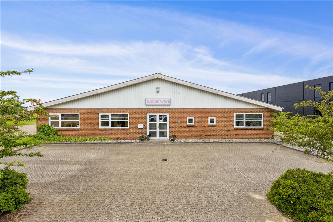 Bygningen er opført i en klassisk og robust konstruktion med røde mursten og et bølgeeternittag, som er både vedligeholdelsesvenligt og langtidsholdbart. De moderne plastvinduer og Troldtekt-lofter, der går gennem hele bygningen, skaber et lyst og behageligt arbejdsmiljø med god akustik og energieffektivitet.Varemodtagelsesområdet er praktisk placeret og effektiviserer modtagelse af varer. Den er afgrænset fra det store lager, således varmen ikke ryger ud af porten i de kolde måneder. Bygningen rummer fire selvstændige kontorer, som tilbyder fleksible arbejdsstationer, velegnede til administrativt arbejde. Ved hovedindgangen mødes man af en indbydende entre med garderobeplads og nem adgang til bygningens øvrige faciliteter.