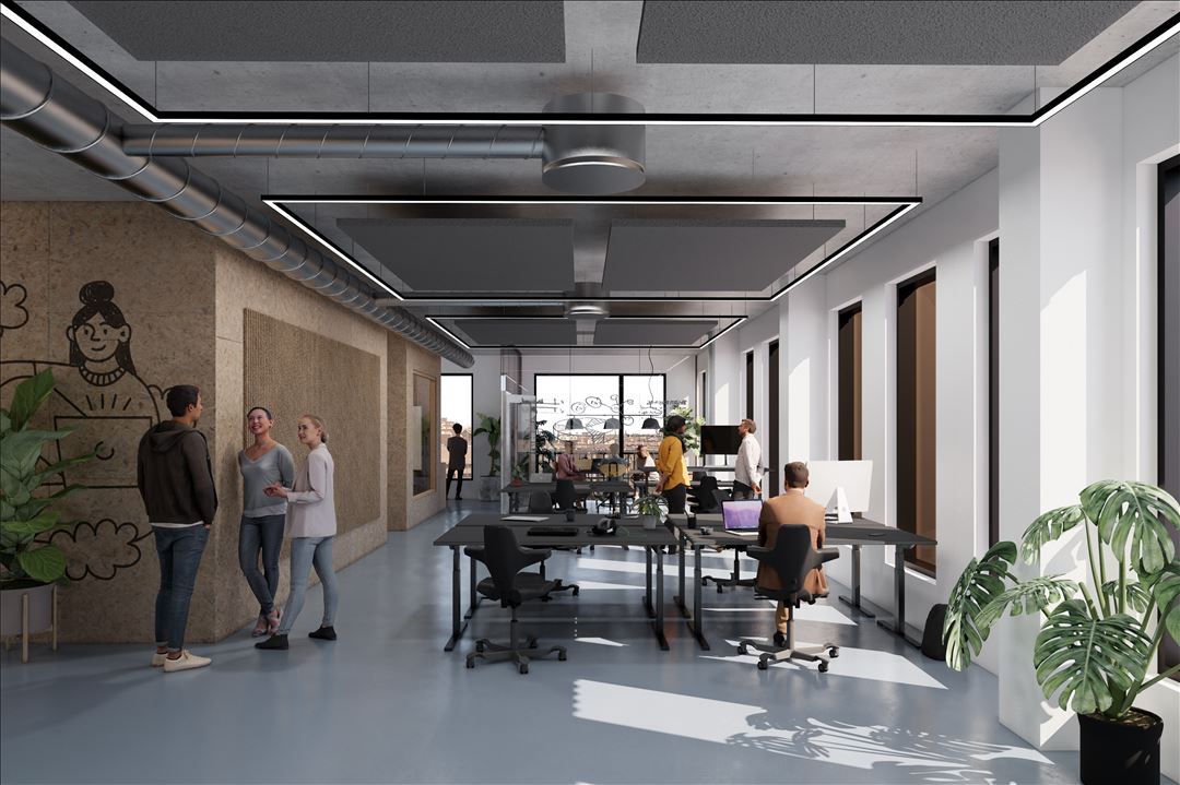 Kontoretagerne rummer hver 465 m², der er indrettet som moderne kontorarbejdspladser med højt til loftet, masser af dagslys samt fleksible indretningsmuligheder. Kontorarbejdspladserne er placeret langs facaderne for at sikre maksimale lysforhold. I hvert hjørne er der skabt mulighed for mødelokaler eller cellekontorer. I den midterste del af etagerne indrettes stillerum, toiletter, depot- og kopirum samt tekøkken. Ejendommen installeres med ventilations- og køleanlæg, for at opnår et sundt og optimale indeklima.