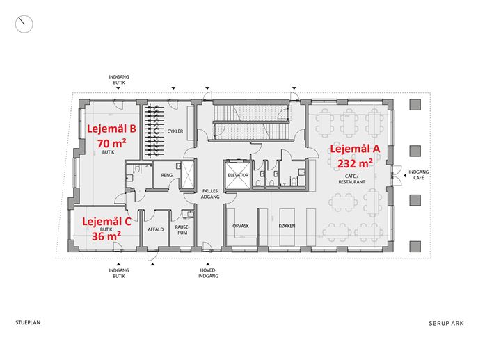 Ejendommens stueetage er indrettet med 3 lejemål, der enten kan benyttes til restaurant, café, bager eller butik. De 2 butikslejemål mod Carl Blochs Gade har en stor eksponeringsfacade og er oplagt for almindelig butik, mindre café/bagerudsalg. Lejemålet mod Godsbanen er oplagt til café eller restaurant, hvor der vil være god plads til restaurantens gæster, samt mulighed for udeservering på den sydvendte terrasse. Her bliver ens gæster en naturligdel af Godsbanens unikke miljø, hvor restauranten/caféen vil kunne danne rammerne for god mad, drikkevarer og servering. Det vil ligeledes være muligt at tilbyde ejendommens kontorlejere madordning, i form af morgenmad, frokost og evt. snacks ordninger.