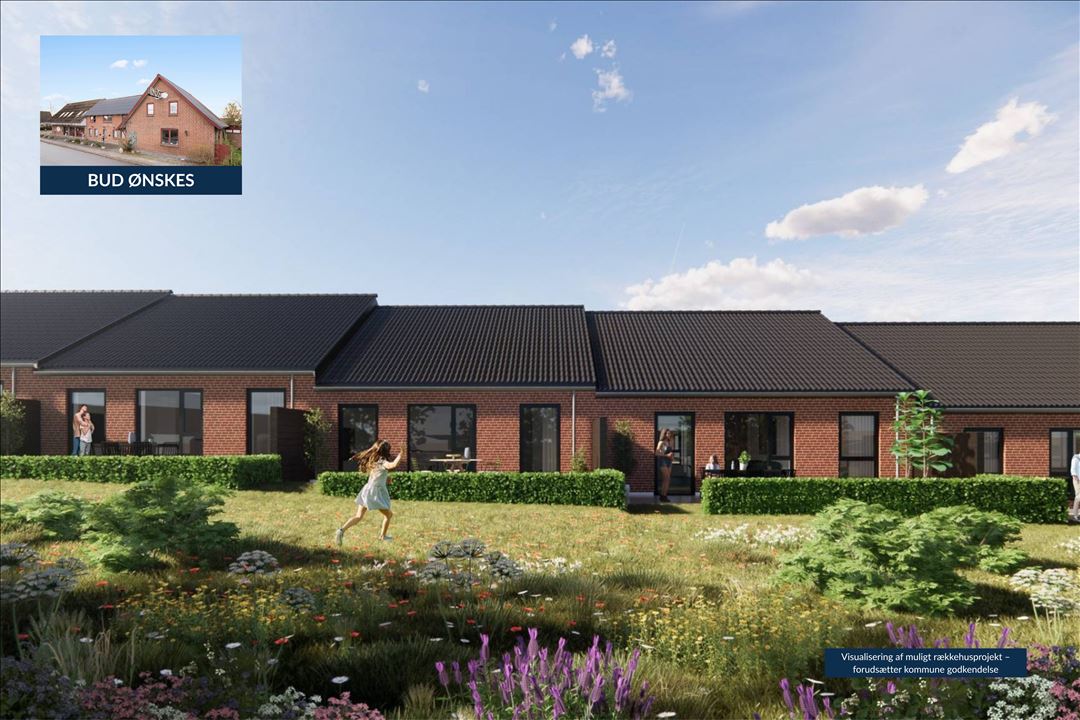 Der er nu udarbejdet en visualisering, som viser et muligt ræk­ke­huspro­jekt på grunden - et spændende eksempel på, hvordan ejendommen potentielt kan omdannes til boligformål.