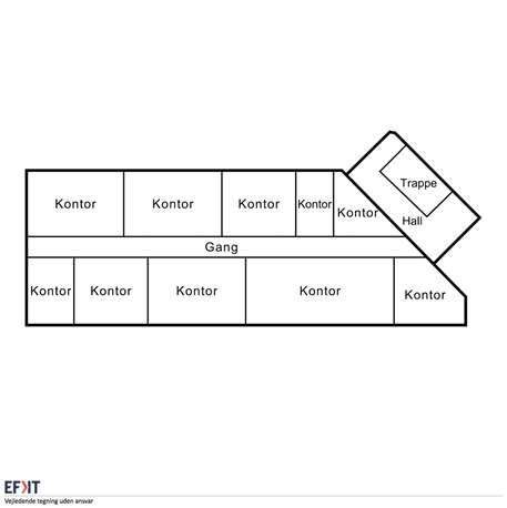 Lejemålet er pt. indrettet med lang fordelergang med kontorer på begge sider af gangen i forskellige størrelser. Toiletter etableres efter nærmere aftale.