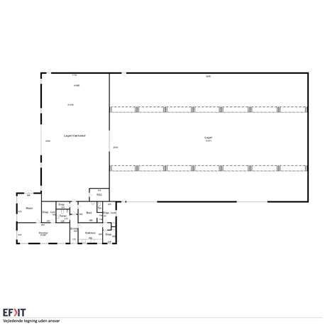 Selve hallen er på 1.225 m² og rummer en mindre del på ca. 200 m² som er opvarmet, samt den resterende del som er uopvarmet og uisoleret. Der er 3 porte i ejendommen. Én stor port i gavlen som måler b 5,4 x h 5,3 m. 2 porte i siden af bygningen på b 5,5 x h 4,2 m og b 3,7 x h 4,2 m.