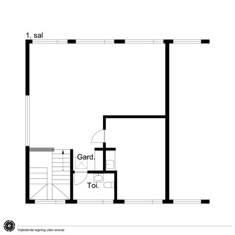 Ejendommen er indrettet i 2 etager, hvor lejemålet på 1. sal udgør 100 kvm. Lejemålet er indrettet med stort åbent kontor. Te-køkken / møderum samt toilet og garderobe. Lejemålet fremtræder overalt lyst og venligt med nedhængte akustik loft med armaturer med indirekte belysning.