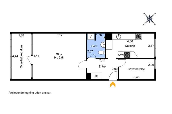 Køkkenet er funktionelt og veludstyret med god skabsplads og mulighed for at indrette en spiseplads, hvilket gør det til et naturligt samlingspunkt i boligen. Soveværelset er rummeligt og giver mulighed for personlig indretning, mens badeværelset er moderne og praktisk indrettet med stilrene fliser og en bruseniche.