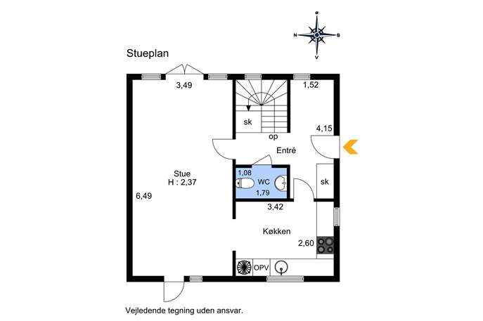 Stueetagen byder på en rummelig entré med adgang til gæstetoilet, og herfra træder du direkte ind i boligens hjerte – den lyse stue i åben forbindelse med køkkenet, som skaber et naturligt samlingspunkt for familien.