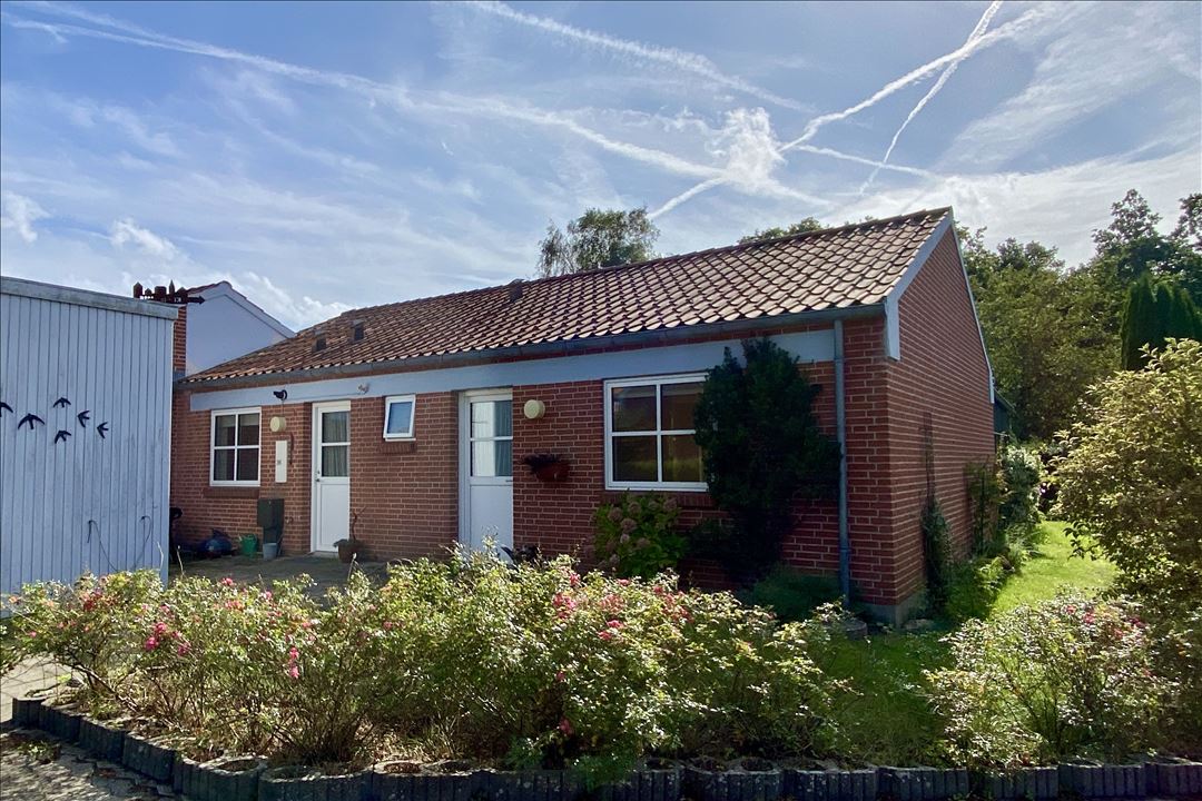 Boligen er opført i røde sten og har desuden et mindre udhus med plads til cykler og haveredskaber.