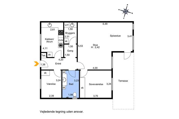 Boligen indeholder bl.a. Entré med adgang til separat spisekøkken med spiseplads. Desuden er der adgang til 2 værelser, samt bryggers og stort badeværelse med bruseniche i en god størrelse. Derudover har boligen stor stue med mange møbleringsmuligheder og med udgang til terrasseafsnit og haven.