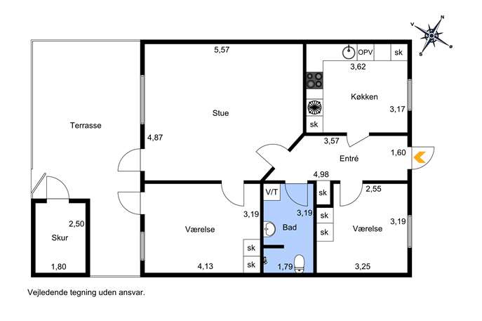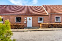 Boligen er indrettet med en lys entré med klinkegulv, garderobeplads og teknikskab. Her er et dejligt lyst spisekøkken med velholdte, lyse elementer, lyst rustikloft og et behageligt lysindfald. Kombineret spise- og opholdsstue med lyst rustikloft, dejligt lysindfald og udgang til syd/vestvendt terrasse som er indhegnet - her er adgang til mindre udhus. Endvidere 2 lyse værelser, som begge er med faste skabe samt et pænt badeværelse med lyse klinker, muret bruseniche, lyst bademiljø med hvid nedsænket vask og vaskesøjle.