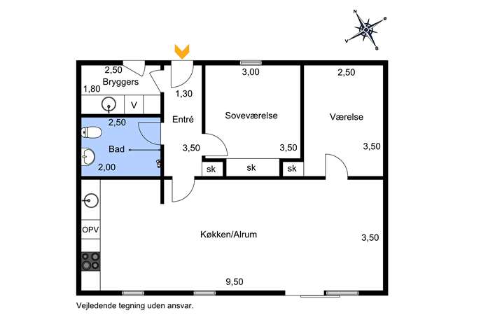 Huset er praktisk indrettet med stort køkken-alrum-stue i 1 med udgang til sydvendt terrasse og dejlig have udlagt i græs. Dertil et godt soveværelse med faste skabe samt et ekstra gæsteværelse/hobbyrum/kontor. Fint badeværelse med klinkegulv og brus bag glas-foldedøre. Bryggers hvor installationerne er samt et praktisk bord med vask.