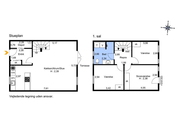 Indretningen byder velkommen med en entré, der fører videre ind i et stort og lyst køkken-alrum med direkte udgang til en sydvendt terrasse.