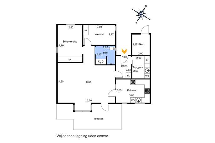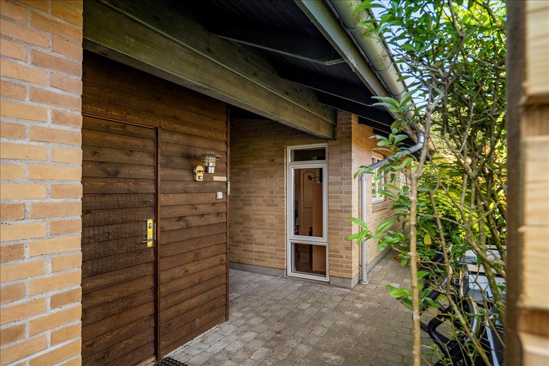 Du bydes velkommen af den åbne éntre. Her er der plads til at hænge sit overtøj. Herfra har du adgang til bryggers med vaskefaciliteter. Videre ledes du ind til den store stue med et fantastisk lysindfald. Her er der plads til både et sofa- og spisebordsarrangement. Desuden får du udgang til en skøn terrasse. Køkkenet er i åben forbindelse med stuen via en fransk dør. Her får du masser af skabs- og bordplads. Derudover er der også plads til et lille spisebord. Badeværelset med bruseniche byder på lyse elementer og opbevaringsplads.