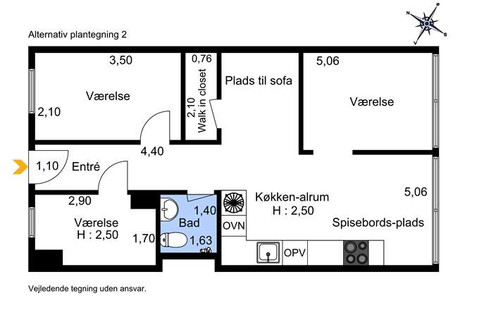 Alternativ plantegning: Mulighed for etablering af ekstraværelse i stuen, hvis lejligheden skal deles. Spørg mægler for mere information.