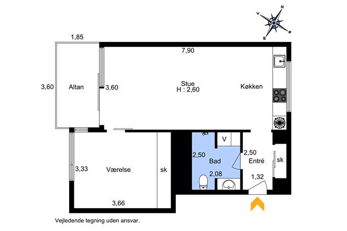 Lejligheden byder på en åben og veldisponeret planløsning med et stort opholdsrum, hvor stue og køkken smelter naturligt sammen. Fra stuen er der udgang til en stor vestvendt altan, hvor aftensolen kan nydes til fulde. Soveværelset har god skabsplads og samme fantastiske udsigt, mens badeværelset fremstår lækkert og rummeligt med separat bruseniche, vaskemaskine og tørretumbler.