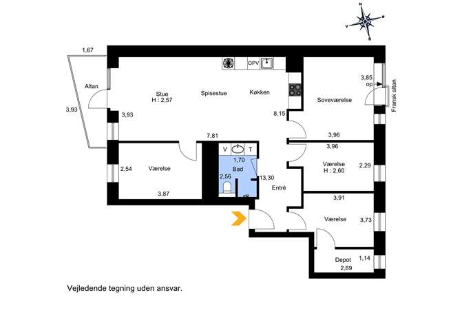 Lejligheden rummer hele fire værelser – heraf et oplagt forældresoveværelse med fransk altan og tre yderligere værelser, der kan indrettes som børneværelser, gæsteværelser eller kontor. Fleksibiliteten i planløsningen gør det let at tilpasse hjemmet til skiftende behov.