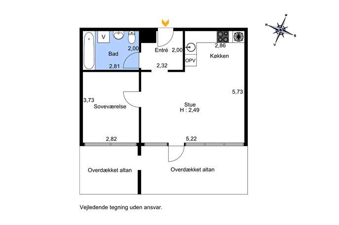 Denne lyse 2-værelses lejlighed på 1. sal er perfekt til singlen eller parret uden børn. Stuen og køkkenet er i åben forbindelse, så du kan jonglere med gryder, potter og pander, uden at blive adskilt fra gæsterne, men stadig er en del af hyggen – og hvorfra der er udgang til den syd-vest vendte terrasse. Soveværelset giver ro og privatliv, og ikke at forglemme badeværelset med badekar, som inviterer til afslapning og selvforkælelse efter en lang dag – et lille luksus-øjeblik midt i hverdagen og her finder du også plads til vaskemaskinen.