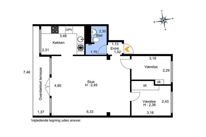 Lejlighedens veludnyttede planløsning byder dig indenfor i en entré med adgang til et pænt badeværelse. Fra entréen træder du videre ind i den lyse stue, som udgør lejlighedens naturlige samlingspunkt. Herfra er der adgang til to gode værelser, der kan indrettes som soveværelse, børneværelse, kontor eller gæsteværelse.