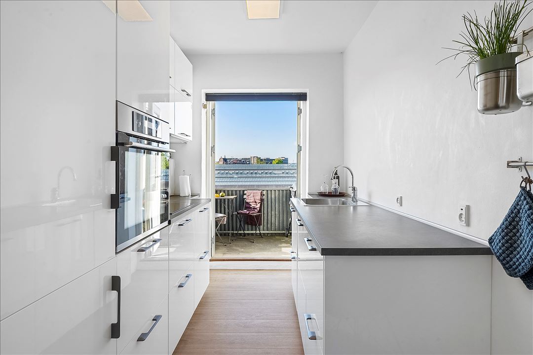 Det flotte køkken med hvide fronter er indrettet med både funktionalitet og stil for øje, og herfra er der direkte adgang til den skønne og store sydvendte altan, hvor du kan nyde solen stort set hele dagen.
