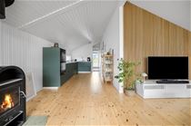 Huset, som blev opført i 1999 og som er renoveret gennem de seneste par år, fremstår som en harmonisk kombination af moderne komfort og klassisk kolonihavestemning. Indenfor mødes du af loft til kip og store vinduespartier, der fylder det åbne leverum med lys og luft. Det nye IKEA-køkken smelter smukt sammen med den varme atmosfære – og brændeovnens knitren fuldender hyggen. Boligen rummer også to soveværelser, et stilrent badeværelse med bruseniche og kombineret vaskemaskine/tørretumbler.