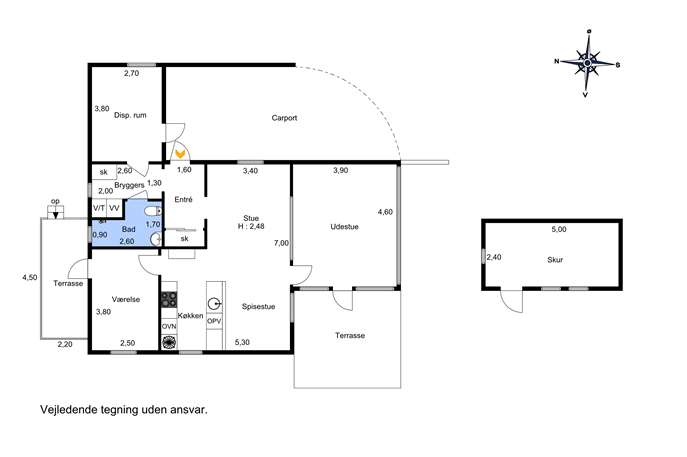 Indeholder: Entre, bryggers/vaskerum, dejligt, køkkenalrum med plads til både spise- som sofaarrangement, her er pænt køkken med gode hvidevarer og luft til luft varmepumpe. Sydvendt udestue fra 2021 med udgang til træterrasse. Soveværelse med udgang til terrasse. Badeværelse med muret bruseniche og tidligere udhus som kan fungere som gæsteværelse/anneks. Udvendig er dejlig have med plads til sommerens spil og leg. Carport med plads til bilen. Udhus med plads til haveredskaber.