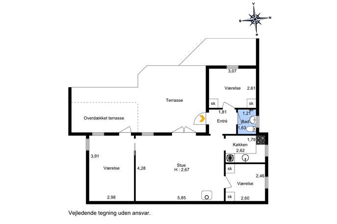 Hjertet i huset er den lyse og åbne stue, som flyder sammen med spisestuen – et perfekt rum til både hyggelige aftener med vennerne, fælles måltider eller stille stunder foran brændeovnen, der står tæt ved og spreder en behagelig varme. Fra stuen er der direkte udgang til en vestvendt terrasse, hvor du kan nyde eftermiddags- og aftensolen i fred og ro. Her er både åbne og overdækkede områder, så du kan sidde ude, uanset om solen skinner, eller regnen drysser stille.