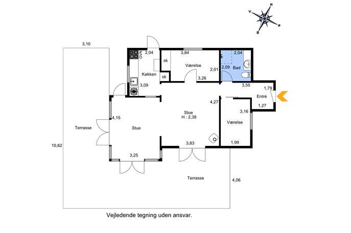 Du bydes velkommen i en entré, hvorfra der er adgang til et pænt badeværelse samt et værelse – perfekt som gæste- eller børneværelse. Videre finder du en hyggelig stue med brændeovn, som skaber en varm og indbydende atmosfære året rundt. I forlængelse af stuen ligger en dejlig udestue – herfra er der direkte udgang til terrassen, så sommerens måltider nemt kan nydes under åben himmel.
