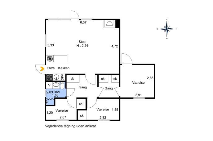 Herudover finder I tre soveværelser, der giver god plads til både familie og gæster, mens badeværelset er funktionelt indrettet med brus, vask og toilet.