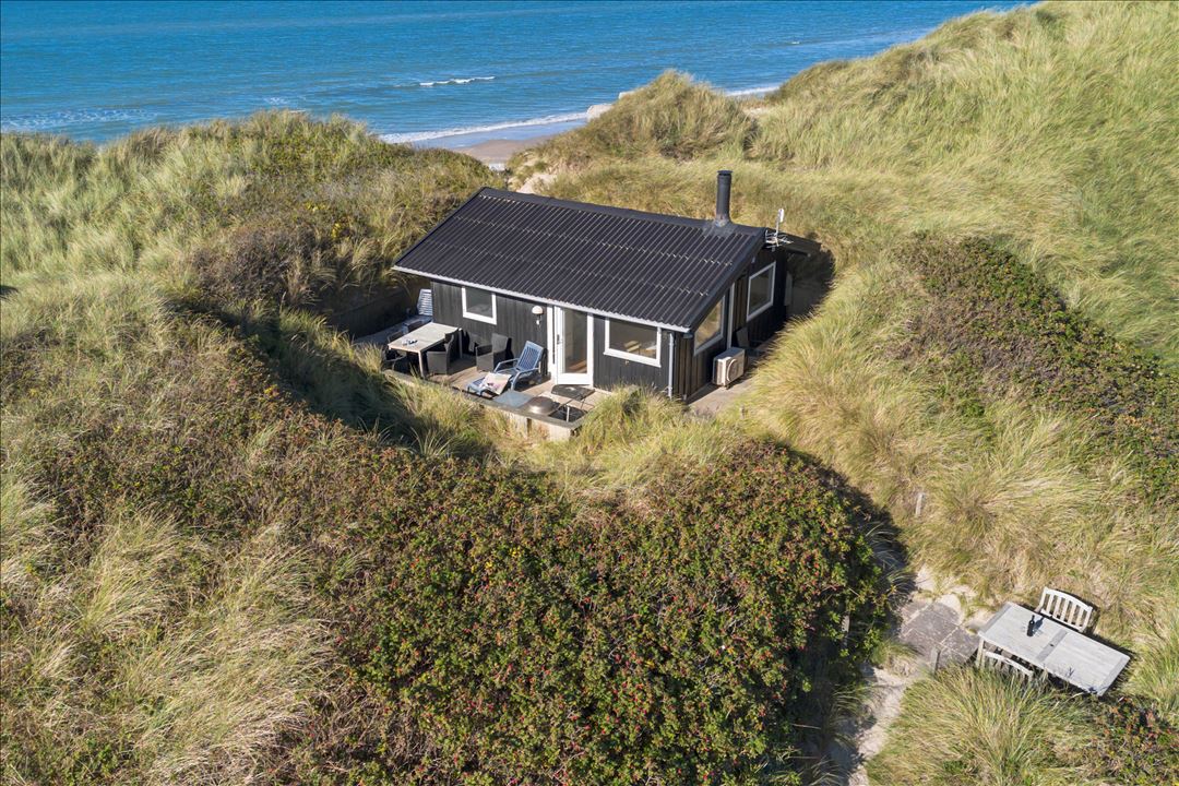 Den 1.006 m² store naturgrund er en oplevelse i sig selv. Klitterne giver både læ og privatliv, mens små kroge skaber naturlige oaser, hvor man kan trække sig tilbage. Den sydvendte terrasse på 20 m² indbyder til lange, solrige dage, hvor vestkystens særlige stemning - rå og kraftfuld, men samtidig rolig og afslappende, virkelig kan mærkes.