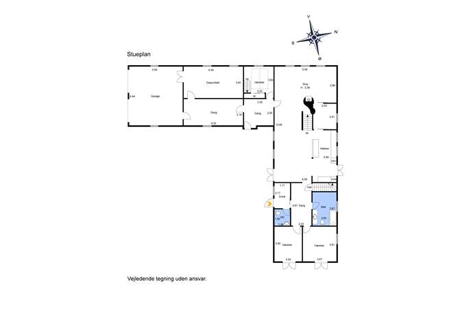 Stuehuset - 358 m2 renoveret idyl Det rummelige stuehus blev totalrenoveret i år 2000 og tilbyder en fantastisk boligoplevelse. Hjertet i hjemmet er det store landkøkken, der smelter sammen med spisestue og opholdsrum – et perfekt sted til store middagsselskaber eller hyggelige familiestunder omkring plankebordet. Her er desuden en charmerende brændefyret masseovn.