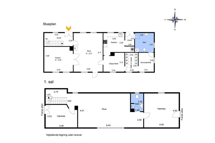 1. sal: Her har I den private afdeling i ejendommen, her er lyst og lækkert og fritlagte hanebånd – Stor opholdsstue – 2 værelser, begge med franske altaner i gavlene – Badeværelse med bruseniche, vask og toilet.