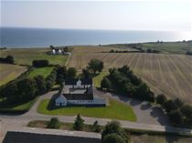 Haven og de grønne arealer omkring stuehuset byder på store græsplæner, gamle træer og et landskab, der naturligt glider ned mod kysten. Udsigten over vandet er imponerende – både i morgensolen og ved aftensolens varme farver over horisonten.