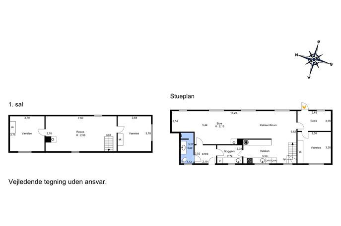 På 1. sal møder du en stor og hyggelig repos/stue med skrå vægge og brændeovn – perfekt som multirum, hjemmekontor eller teenageområde. Herudover findes to gode værelser med fine indretningsmuligheder.