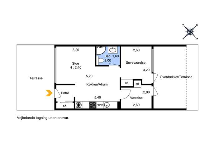 De to værelser har begge direkte adgang til den nordøstvendte, overdækkede terrasse, hvor morgenskaffen kan nydes i ro og fred. Fra entreén er der udgang til en stor sydvestvendt terrasse, som indbyder til solrige eftermiddage og lange sommeraftener. De to udeområder giver en helt særlig fleksibilitet og gør det muligt at nyde udelivet uanset tidspunkt på dagen.