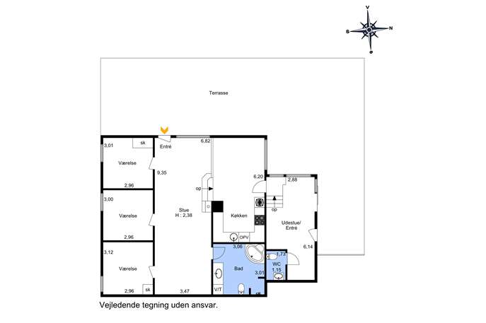 De tre værelser suppleres af et badeværelse med bruseniche og et stort hjørnebadekar, og her er endda plads til va­ske­fa­ci­li­te­ter. Læg også mærke til den charmerende udestue, der i øvrigt fungerer som entré på praktisk vis. Udestuen har et flot flisegulv og udgang til terrassen, Afrundingsvis har man også fundet plads til et gæstetoilet.