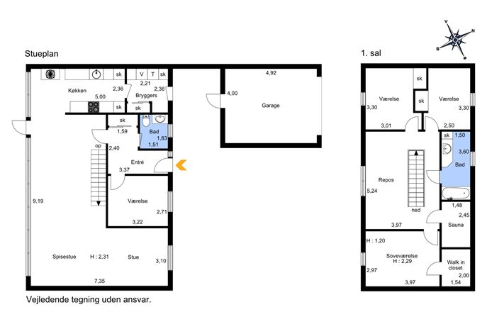 På førstesalen finder du boligens væ­rel­ses­af­de­ling med to gode og in­dret­nings­ven­li­ge værelser, et stor repos samt et rummeligt badeværelse med både brus og badekar i et. Herfra er der adgang til et stort soveværelse med walk-in-closet og tilhørende sauna.