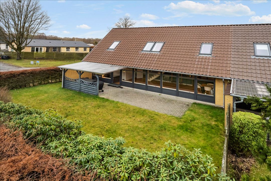 Boligen byder velkommen i en rummelig entré med adgang til både et værelse og et pænt gæ­ste­ba­de­væ­rel­se. Videre åbner hjemmet sig op i et stort og lyst opholdsrum, hvor stue og spisestue ligger i åben forbindelse – ideelt til både hverdagshygge og gæster. De store vinduespartier giver et skønt lysindfald og skaber en naturlig overgang til haven.