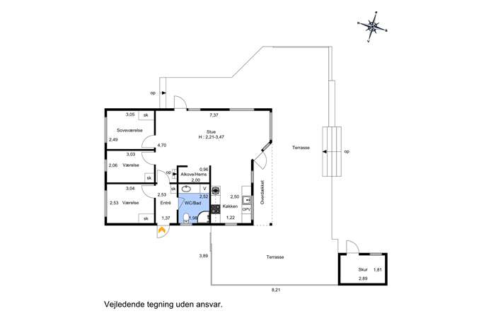 Sommerhuset fremstår lyst og indbydende med en gennemtænkt planløsning på 91 m². Hjertet er den store stue med loft til kip og store glaspartier, der inviterer dagslyset indenfor og skaber en harmonisk overgang mellem ude og inde. Fra stuen er der direkte udgang til den brede træterrasse, som giver masser af plads til afslapning, grill og lange sommeraftener med udsigt over området.