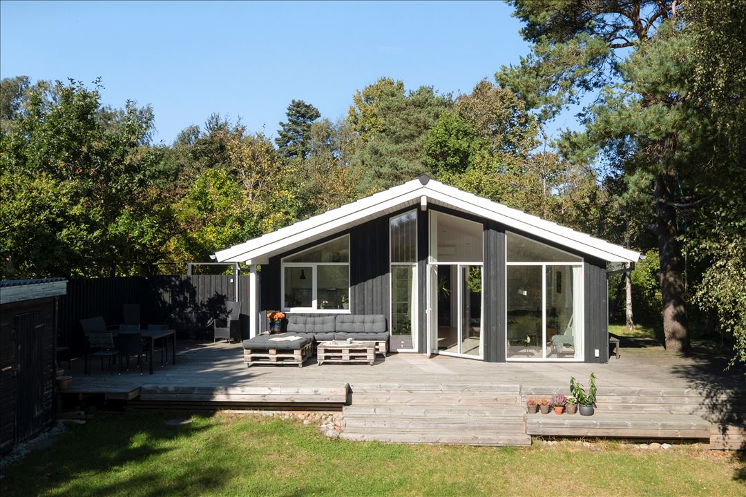Sommerhuset er godt isoleret, så du kan bruge det hele året rundt. Huset er opført med klassisk træbeklædning – naturligvis sortmalet, et solidt tag bestående af betontagsten, og opvarmningen klares nemt via varmepumpe. Her får du et næsten ved­li­ge­hol­del­ses­frit sommerhus med en funktionel og familievenlig indretning.