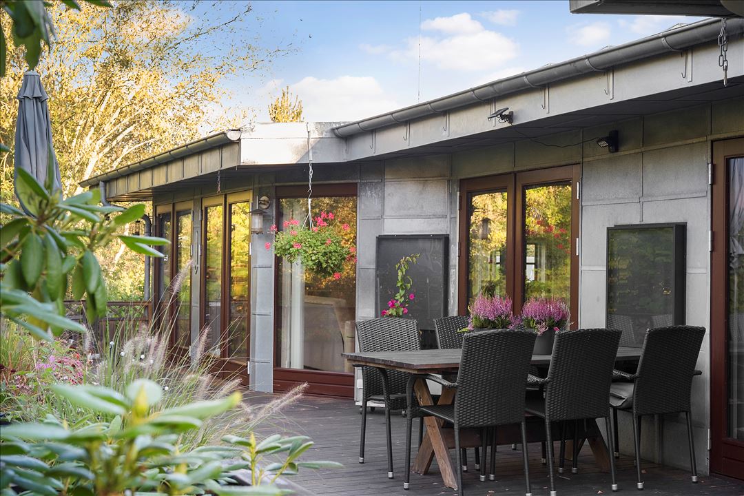 Terrassen løber generøst langs facaden, vender perfekt mod sydvest og fanger solen fra formiddag til sen aftensglød. Her er både åbne solpladser til liggestolen, hyggelige kroge til morgenkaffen og en overdækket del, så middagen kan rykkes ud, selv når duggen falder. Krukker, plantekasser og hængeplanter skaber en grøn, blomstrende ramme – og rækværket giver læ og privatliv.