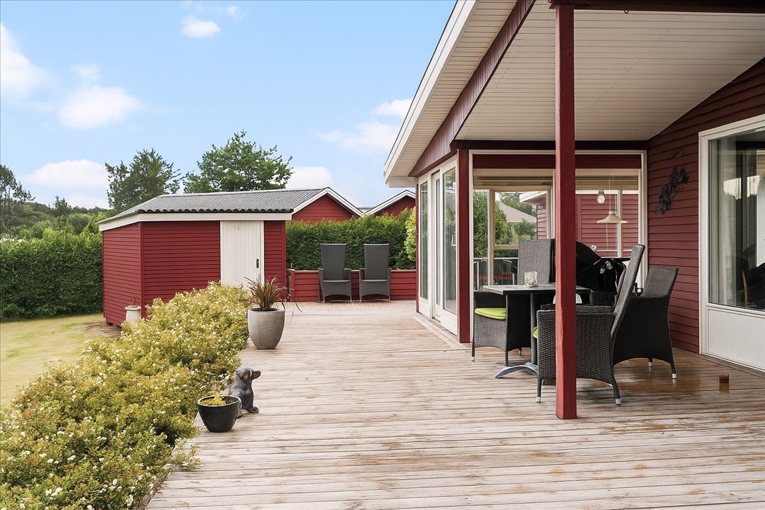 Fra stuen er der direkte udgang til en skøn træterrasse, hvor en del er overdækket, så man kan nyde udelivet i al slags vejr. Her er masser af plads til både grill, loungemøbler og gæster – en oplagt ramme om ferier, weekender og lange sommeraftener. Haven er anlagt, så den er let at holde, og den tætte hæk omkring grunden sikrer ro og privatliv.