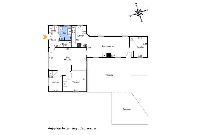 Fra stuen er der adgang til to af husets i alt tre værelser, som begge ligger praktisk placeret i forlængelse af opholdsrummet. Det tredje værelse finder man i husets nordlige del – lige ved siden af det hyggelige køkken/alrum. Her er der direkte udgang til den solrige terrasse, så både måltider og sommerdage let kan flyttes ud i det fri.