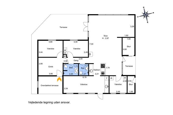 Plantegningen åbner muligheder for andre planløsninger - mangler du fx et ekstra værelse, er der mulighed for at undersøge, om enten entreen eller udestuen kan indrettes som værelse.