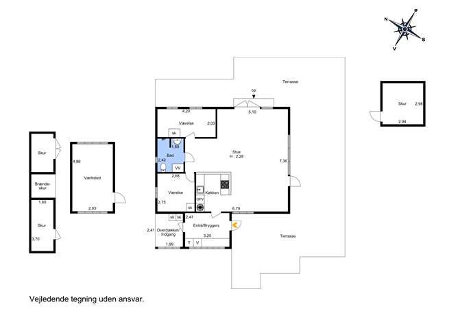 Udenfor finder man et stort udhus på ca. 14 m² med flot lysindfald fra dobbeltvinduer mod haven og marken Det kan benyttes som værksted, anneks (ikke godkendt til beboelse) eller et sødt havehus. Desuden et fritliggende udhus på 12 m² samt 2 brændeskure (ikke registreret i BBR). Der er indkørsler på begge sider af huset. Haven byder på en hyggelig terrasse, der er udnyttet med havemøbler på 3 af husets sider, så solen kan være fanges hele dagen – perfekt til grill og samvær. Fra terrassen fører en trappe ned til en skjult oase med frodige træer og bålplads, hvor haven giver en følelse af at være midt i skoven – ideel til afslapning og hyggelige stunder.